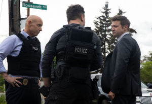 From L-R: Hugh Dillon, Hamish Allen-Hedley (back), and Jeremy Renner in a scene from Mayor of Kingstown. Photo by Emerson Miller.