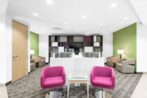 Within this three story curved glass atrium is 55 private offices and three meeting rooms. Offices start at $270 per month. Virtual offices are also offered at $90 a month that includes main handling and a professional business address.