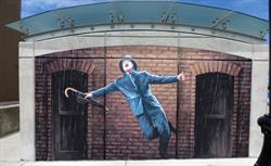 David Zing’s “Singing in the Rain” mural (located on the entrance to the underground parking structure on S. 5th Ave. in downtown Ann Arbor) is of actor Gene Kelly singing and dancing in the iconic movie scene – incorporating a real lamppost into the mural. Why Gene Kelly? Gene’s daughter, Kerry Kelly Noviak, is a longtime Ann Arbor resident.