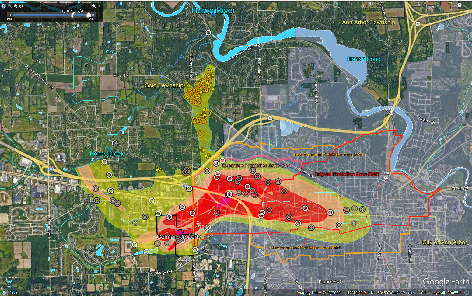 The plume originates from groundwater contamination linked to the former Gelman Sciences site, where 1,4-dioxane—a likely human carcinogen—entered the aquifer and began migrating beneath western Washtenaw County. Over time, the contamination spread far beyond its original source, raising concerns about its reach toward residential neighborhoods and municipal water systems.