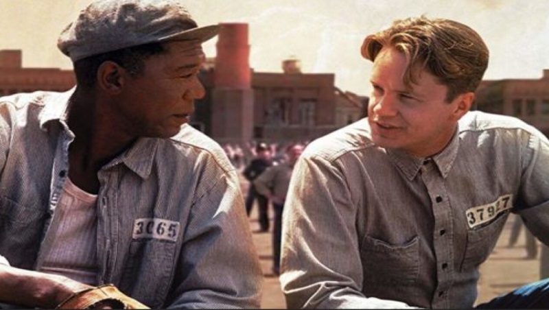 “Shawshank” occurs in Portland, MN circa 1947 and is narrated by inmate Ellis “Red” Redding (Oscar winner Morgan Freeman, “Million Dollar Baby”). Banker Andy Dufresne (Oscar winner Tim Robbins, “Mystic River”) is sentenced to two consecutive life sentences for murdering his wife and her lover, although he is innocent. Andy and Red, a contraband smuggler who’s been “known to locate certain things from time to time,” become friends. Red procures a small rock hammer and a large poster of legendary Hollywood starlet Rita Hayworth for Andy.