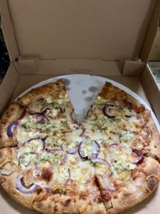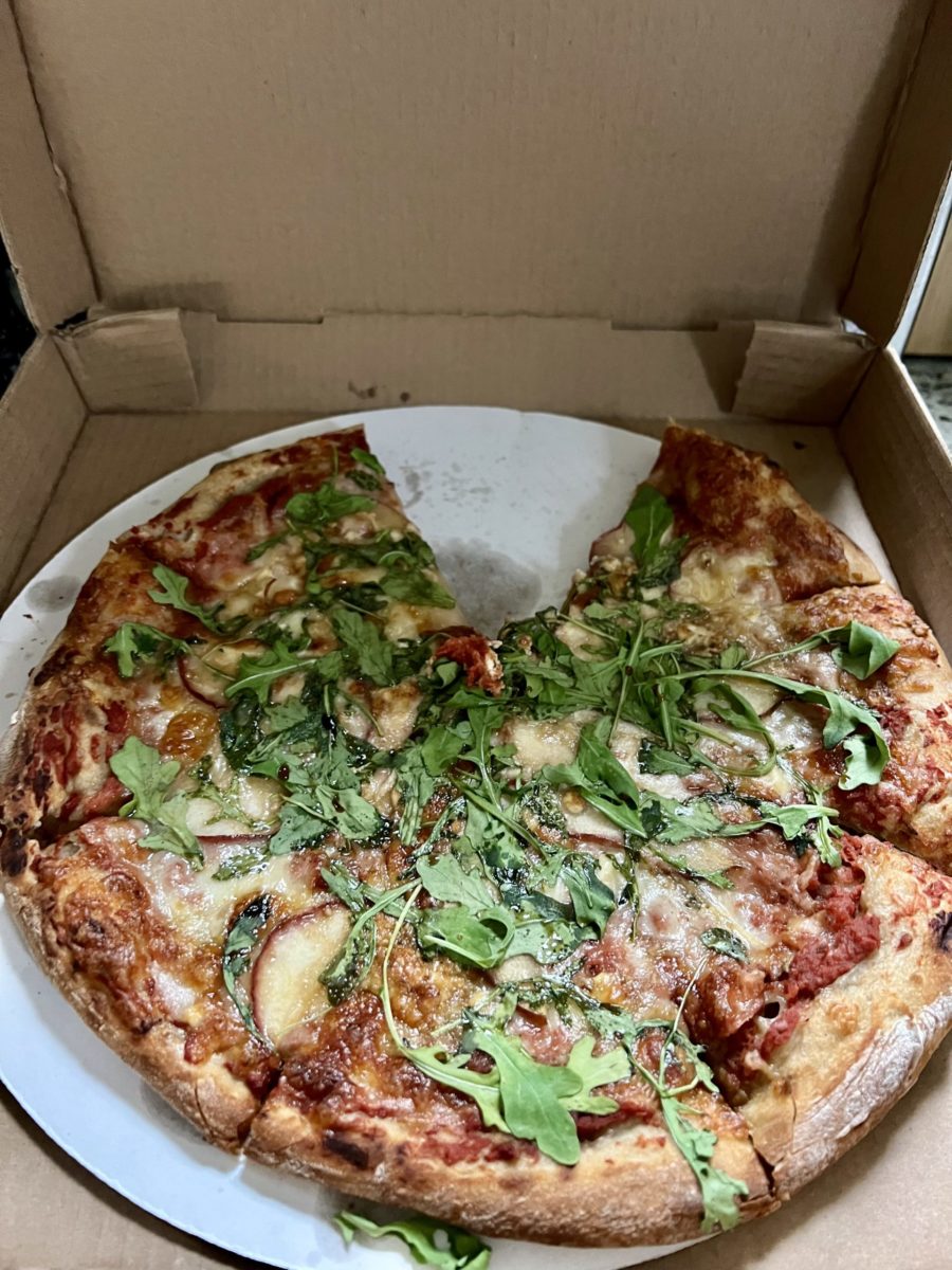 This gray and drizzly day, the outdoor tables were occupied by race participants, making it less feasible for casual dining. Consequently, I decided to take my pizzas home to enjoy them in comfort.