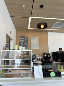 This café is a vibrant space filled with studying college students, busy professionals and members of the local community. The cafe’s abundant natural lighting, paired with its open layout and ample seating, makes it an ideal environment for a variety of activities. Whether customers are catching up with friends, getting work done, or studying for an exam, the space feels comfortable and inviting.
