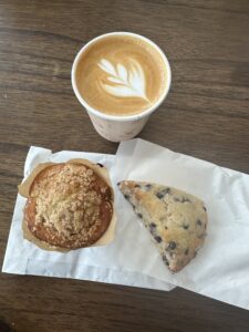 Hazel Coffee Co. doesn’t stop at drinks. They offer a large pastry case filled with tempting options that make it hard to choose just one. With different pastries available each day, there’s always a variety of treats to pair with your drink for theperfect pick-me-up. We tried the blueberry muffin and the chocolate chip scone, and their sweetness and softness paired perfectly with our drinks.