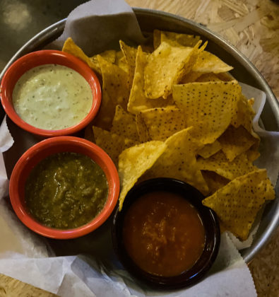 We were presented with a flight of three cups of distinctly different flavorful salsas paired with enough chips to share.