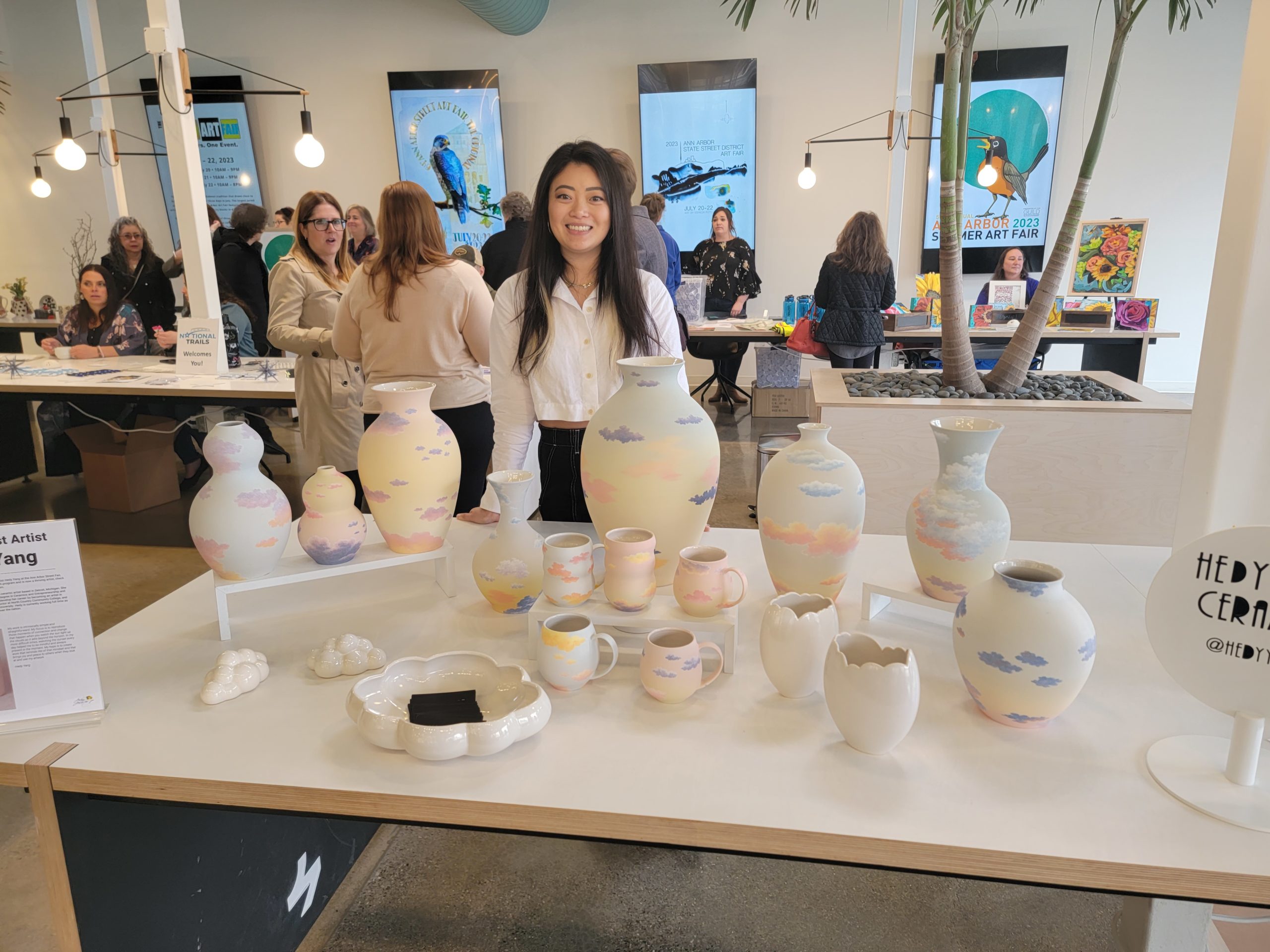 Scarborough’s booth will be on Maynard Street. Ceramics artist Hedy Yang will also be returning to the Art Fair, at Ingles Mall. This year she will be bringing ceramics covered in clouds and sunrises.